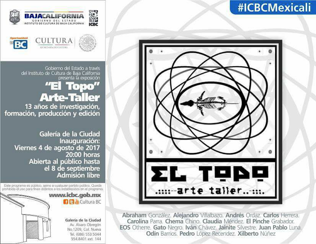 Mexicali, Baja California, jueves 3 de agosto de 2017.- El Gobierno del Estado, a través del Instituto de Cultura de Baja California (ICBC), lo invitan a la inauguración de la exposición El Topo, Arte-Taller, un importante proyecto de 13 años de investigación, formación, producción y edición, donde participan Abraham González, Alejandro Villalbazo, Andrés Ordaz, Carlos Herrera, Carolina Parra, Chema Chino, Claudia Méndez, El Pinche Grabador, EOS Otherre, Gato Negro, Iván Chávez, Jainite Silvestre, Juan Pablo Luna, Odín Barrios, Pedro López Recendez y Xilberto Núñez.