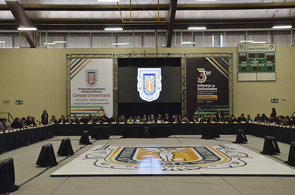 Mexicali, B.C., jueves 22 de febrero de 2018.- El Rector de la Universidad Autónoma de Baja California (UABC), doctor Juan Manuel Ocegueda Hernández, presentó su Tercer Informe en sesión del Consejo Universitario, máximo órgano colegido conformado por representantes de alumnos, docentes y personal administrativo, y ante el Presidente de la Junta de Gobierno doctor Felipe Cuamea Velázquez y el representante del Patronato Universitario, doctor Víctor Manuel Alcántar Enríquez. También se presentaron los Estados Financieros correspondientes al 2017.