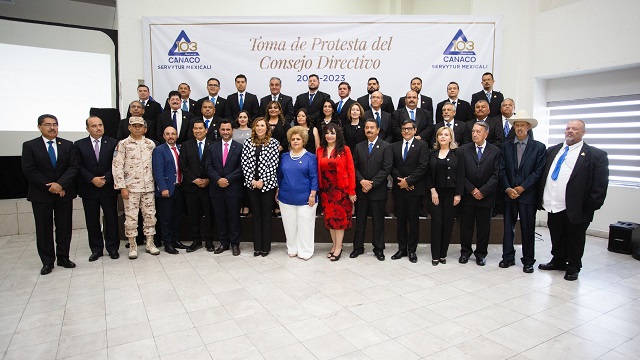 Mexicali, B.C. A miércoles 20 de abril 2022.- Reconociendo su importante contribución en el desarrollo económico de la capital de Baja California, la Alcaldesa de Mexicali Norma Bustamante fue testigo de la toma de protesta del Consejo Directivo de la Cámara Nacional de Comercio, Servicios y Turismo (CANACO), donde se nombró a Lidia Granados como Presidenta de la organización 2022-2023.