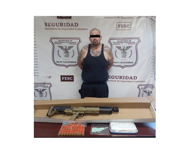 El hombre se identificó como Marco Antonio “N” de 34 años de edad originario de Bakersfield, California, a quien se le encontró entre sus pertenencias un arma de fuego tipo escopeta calibre 12 desabastecida, además de 23 cartuchos útiles.