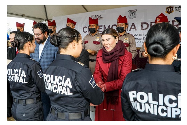 En su mensaje a las y los graduados, sus familias y la sociedad en general, la Titular del Poder Ejecutivo del Estado manifestó la importancia del trabajo que realizan las y los policías bajacalifornianos para avanzar hacia un Estado con mayor seguridad para todas las personas, en el que las niñas, niños y adolescentes puedan crecer con paz y plenitud.