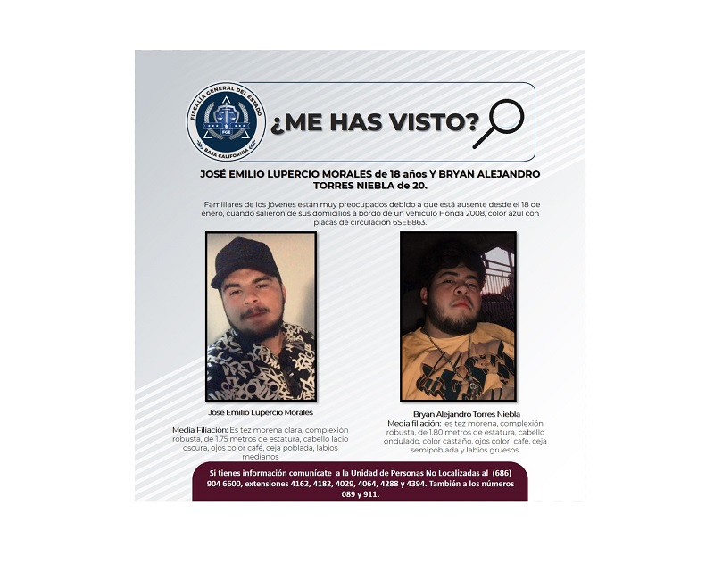 MEXICALI, BAJA CALIFORNIA A 20 DE ENERO DE 2023.- La Fiscalía General del Estado (FGE), a través de la Unidad Especializada para la investigación y Persecución de Delitos de Desaparición Forzada de Personas y Desaparición Cometida por Particulares, solicita la colaboración de los ciudadanos para localizar a José Emilio Lupercio Morales de 18 años y Bryan Alejandro Torres Niebla de 20.