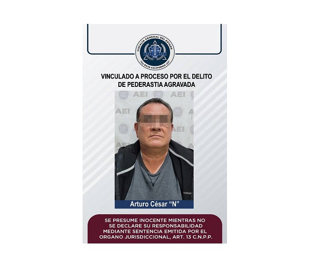 MEXICALI, BAJA CALIFORNIA A 20 DE ENERO DE 2023.- La Fiscalía General del Estado (FGE), en el firme ejercicio de la justicia para no dejar impunes actos de violencia en contra de las niñas, niños y personas vulnerables, obtuvo la vinculación a proceso en contra de un Arturo César “N” por el delito de pederastia agravada.
