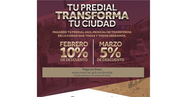 Mexicali, B.C. A miércoles 01 de febrero 2023.- El Gobierno Municipal encabezado por Norma Bustamante Martínez continúa beneficiando a las y los contribuyentes que acudan a pagar su predial puntualmente, otorgando el 10% de descuento durante el mes de febrero.