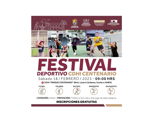 Centro de Desarrollo Humano Integral Centenario y el Instituto Municipal del Deporte y de la Cultura Física invitan a inscribirse al “Festival Deportivo”, el cual, se llevará a cabo este próximo sábado 18 de febrero.