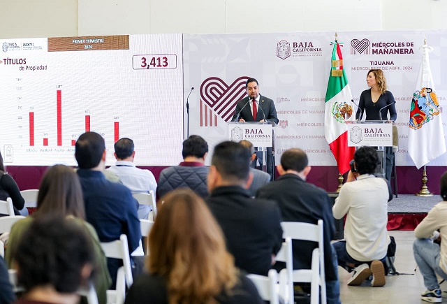 TIJUANA.- 17 de abril de 2024.- Con el fin de garantizar el derecho a la certeza patrimonial, la gobernadora de Baja California, Marina del Pilar Avila Olmeda, informó las acciones en materia de regularización de tierra que se han llevado a cabo durante la actual administración, las cuales cuentan con el apoyo permanente del presidente Andrés Manuel López Obrador con el fin de superar las 4 mil familias beneficiadas.