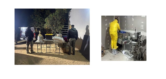 De acuerdo con la carpeta de investigación, se ejecutó orden de cateo en un domicilio ubicado en la colonia Estación Coahuila, en Mexicali, donde los elementos de la Policía Federal Ministerial (PFM), y la SSPC, bajo la conducción del Ministerio Público Federal (MPF), en Baja California, aseguraron el probable narcótico que estaba en diversos contenedores y bolsas, además de la máquina mezcladora metálica y una tableteadora.