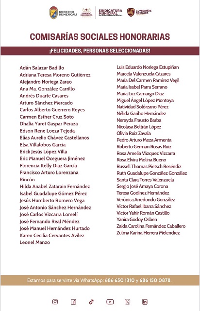 Mexicali, Baja California a 28 de mayo de 2025.- La Sindicatura Municipal de Mexicali informa con orgullo que ya han sido seleccionadas las 51 ciudadanas y ciudadanos que formarán parte de las Comisarías Sociales Honorarias, un mecanismo de participación ciudadana que busca fortalecer la vigilancia de la gestión pública municipal.