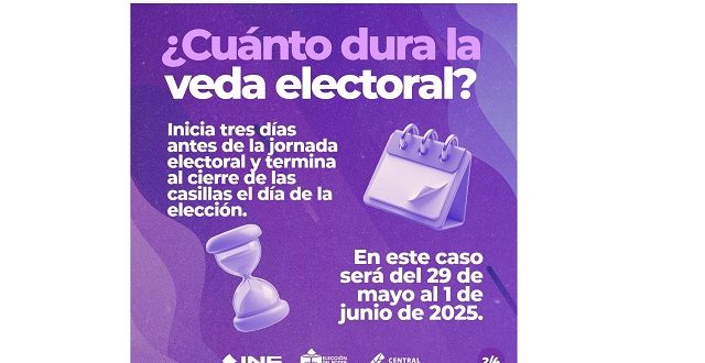 MEXICALI.- 28 de mayo de 2025.- A partir del primer minuto del 29 de mayo inicia el periodo de veda electoral o de reflexión por lo que, desde este momento y hasta el cierre de las casillas del próximo domingo 1 de junio, se suspende la propaganda electoral para que la ciudadanía pueda reflexionar sobre el sentido de su voto en la primera elección histórica del Poder Judicial de la Federación.