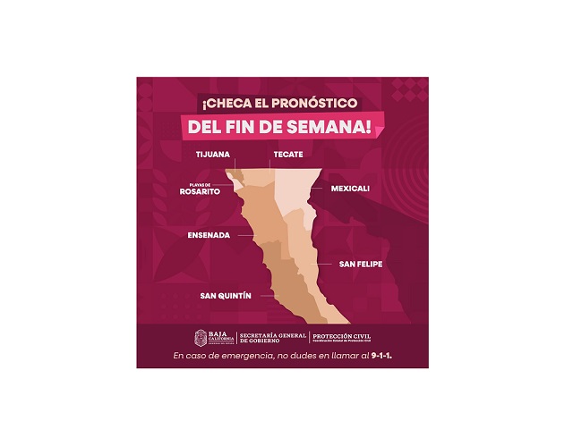 TIJUANA.– 29 de mayo de 2025.- La Coordinación Estatal de Protección Civil (CEPC) informa que, de acuerdo con el pronóstico emitido por el Servicio Meteorológico Nacional, durante este fin de semana se presentarán lluvias dispersas, vientos y un descenso gradual en las temperaturas en diferentes regiones del estado.