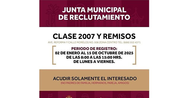 Mexicali, B.C. A 29 de mayo 2025.- El Ayuntamiento de Mexicali, a través de la Junta Municipal de Reclutamiento, informa que la convocatoria para tramitar la Cartilla del Servicio Militar Nacional continúa abierta.