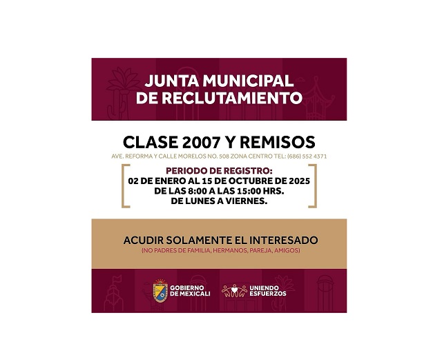 Mexicali, B.C. A 29 de mayo 2025.- El Ayuntamiento de Mexicali, a través de la Junta Municipal de Reclutamiento, informa que la convocatoria para tramitar la Cartilla del Servicio Militar Nacional continúa abierta.