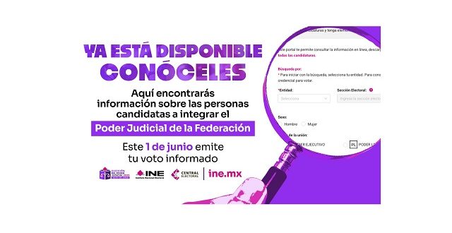 MEXICALI.- 31 de mayo de 2025.- El Instituto Nacional Electoral (INE) creó el sitio “Conóceles, Practica y Ubica”, para que todas las personas que acudan a votar este domingo 1ro de junio en las elecciones judiciales, estén preparadas, esta plataforma la puedes consultar en la liga https://ine.mx/conoceles-practica-y-ubica/.