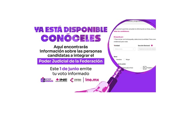 MEXICALI.- 31 de mayo de 2025.- El Instituto Nacional Electoral (INE) creó el sitio “Conóceles, Practica y Ubica”, para que todas las personas que acudan a votar este domingo 1ro de junio en las elecciones judiciales, estén preparadas, esta plataforma la puedes consultar en la liga https://ine.mx/conoceles-practica-y-ubica/.