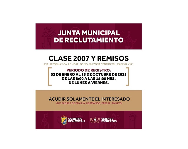 Mexicali, B.C. A 27 de junio 2025.- El Gobierno de Mexicali, a través de la Junta Municipal de Reclutamiento, te invita a tramitar tu Cartilla del Servicio Militar Nacional. Esta convocatoria está abierta para los jóvenes de la Clase 2007 y remisos que aún no han realizado este trámite.