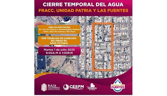 Mexicali. — 30 de junio de 2025.- La Comisión Estatal de Servicios Públicos de Mexicali (CESPM) informa que este martes 1 de julio de 2025 se llevará a cabo un cierre temporal del suministro de agua potable en los fraccionamientos Unidad Patria y Las Fuentes, como parte de los trabajos de conexión de nuevas líneas hidráulicas en la zona.