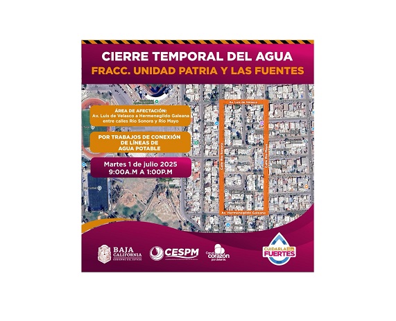Mexicali. — 30 de junio de 2025.- La Comisión Estatal de Servicios Públicos de Mexicali (CESPM) informa que este martes 1 de julio de 2025 se llevará a cabo un cierre temporal del suministro de agua potable en los fraccionamientos Unidad Patria y Las Fuentes, como parte de los trabajos de conexión de nuevas líneas hidráulicas en la zona.