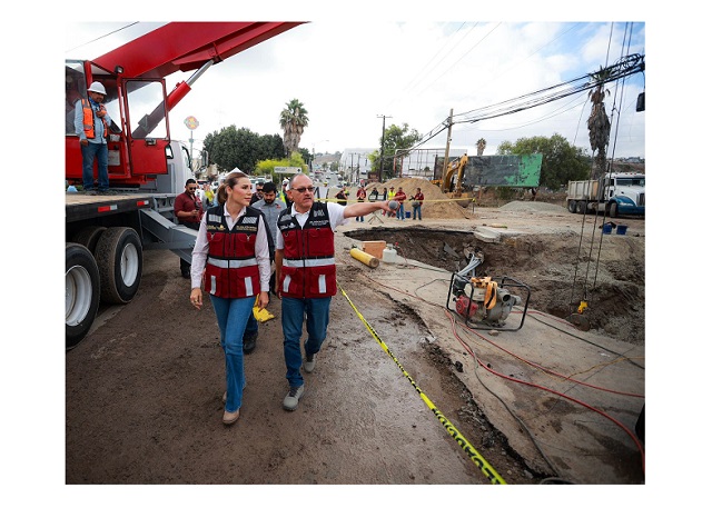 TIJUANA.- 10 de septiembre de 2025.- Derivado de una fuga que provocó la fractura de la tubería del acueducto Florido–Aguaje, a la altura del bulevar Díaz Ordaz, la gobernadora de Baja California, Marina del Pilar Avila Olmeda, supervisó los trabajos de reparación que se realizan para restablecer el servicio en diversas colonias de Tijuana.