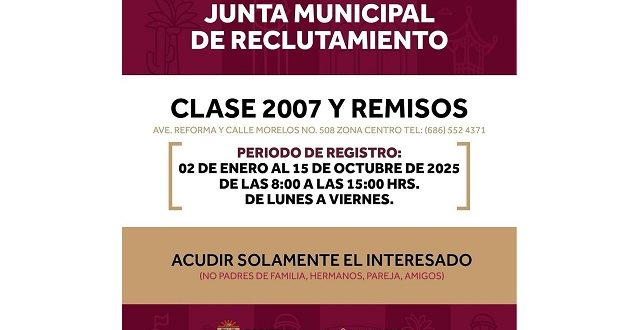 Mexicali, B.C. A 30 de septiembre 2025.- El Ayuntamiento de Mexicali, a través de la Junta Municipal de Reclutamiento, informa que está a pocas semanas de cerrar la convocatoria para tramitar la Cartilla del Servicio Militar Nacional