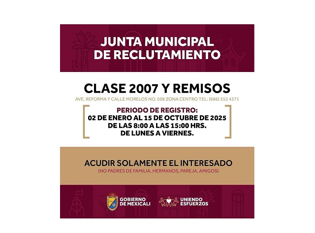 Mexicali, B.C. A 30 de septiembre 2025.- El Ayuntamiento de Mexicali, a través de la Junta Municipal de Reclutamiento, informa que está a pocas semanas de cerrar la convocatoria para tramitar la Cartilla del Servicio Militar Nacional