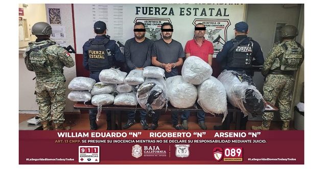 Fue así como se descubrió que William Eduardo “N”, de 34 años y originario de Ensenada; Rigoberto “N”, de 29 años y originario de Badiraguato, Sinaloa; y Arsenio “N”, de 43 años y originario de Tijuana, custodiaban varios bultos flejados que dieron un total aproximado de 56 kilos 460 gramos.
