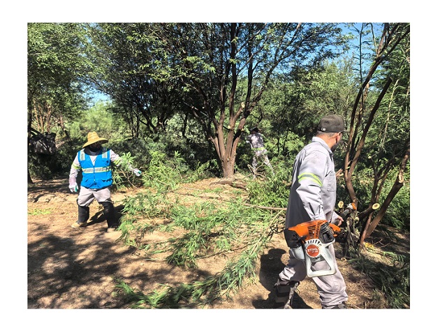 Para seguir con las tareas de mantenimiento, CESPM programó una jornada que contó con la asistencia de seis elementos de poda, un supervisor y el respaldo de una retroexcavadora. Durante los trabajos se aplicaron medidas de seguridad e higiene para prevenir riesgos, como mordeduras de serpientes y otros incidentes.