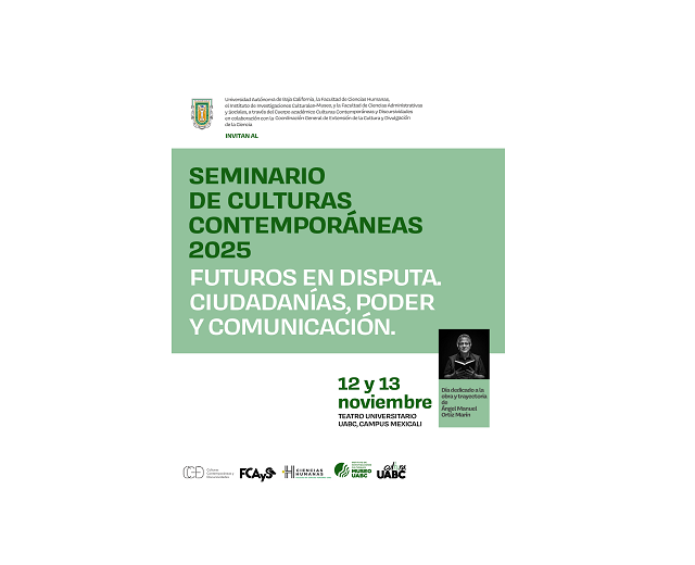 Mexicali, Baja California, viernes 07 de noviembre de 2025.-La Universidad Autónoma de Baja California invita al público bajacaliforniano a las actividades gratuitas del Seminario de Culturas Contemporáneas 2025 “Futuros en disputa. Ciudadanías, poder y comunicación”, a realizarse el miércoles 12 y jueves 13 de noviembre en las instalaciones del Teatro Universitario, campus Mexicali.