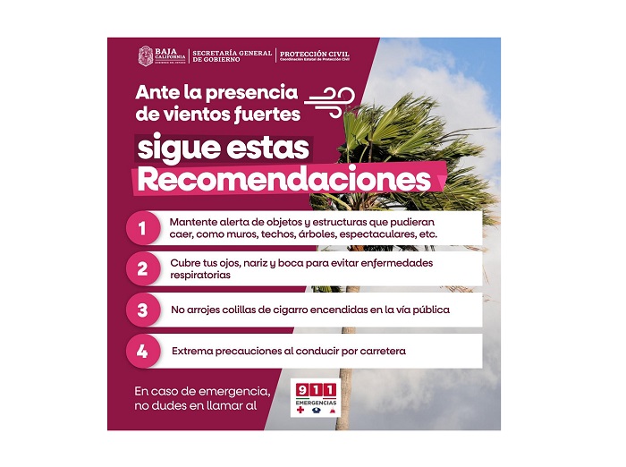 TIJUANA.- 04 de diciembre de 2025.- La Coordinación Estatal de Protección Civil (CEPC), con base en información del Servicio Meteorológico Nacional (SMN) de la Comisión Nacional del Agua (Conagua) alerta a la ciudadanía ante el pronóstico de fuertes vientos en la región a lo largo del día.