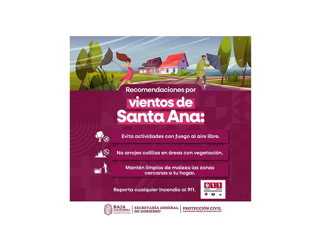 TIJUANA.- 08 de diciembre de 2025.- La Coordinación Estatal de Protección Civil (CEPC), con base en información de la Administración Nacional Oceánica y Atmosférica (NOOA, por sus siglas en inglés) informa sobre el arribo de vientos de Santa Ana en la región durante esta semana, por lo que exhorta a la ciudadanía a extremar precauciones.