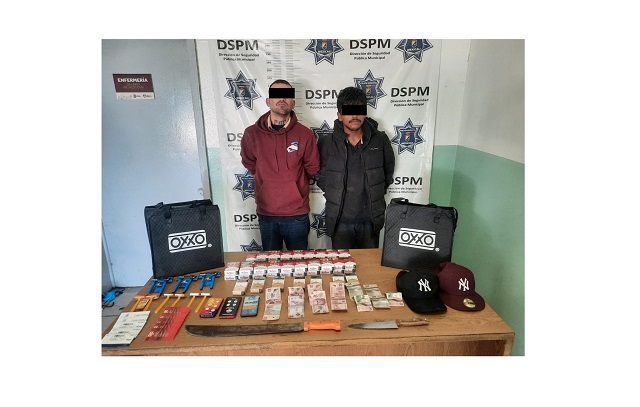 En el lugar fueron detenidos Juan Carlos “N”, de 19 años de edad, y Jorge Alejandro “N”, de 28; a quienes se les aseguró un cuchillo y un machete. También se recuperaron 550 pesos en efectivo, el vehículo robado, 03 teléfonos celulares, 44 cajetillas de cigarros, 10 chips telefónicos y 06 paquetes de rastrillos.