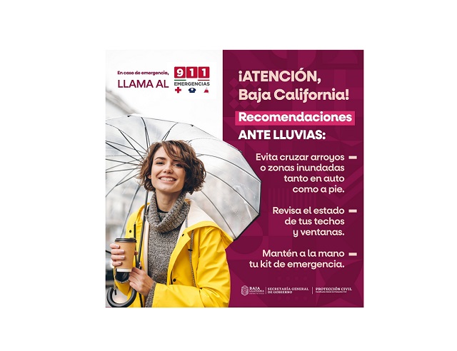 TIJUANA.- 22 de diciembre de 2025.- La Coordinación Estatal de Protección Civil (CEPC) con base en información del Servicio Meteorológico Nacional (SMN), alerta a la población por los pronósticos de probabilidad de lluvias fuertes a muy fuertes, principalmente entre el martes 23 y jueves 25 de diciembre.