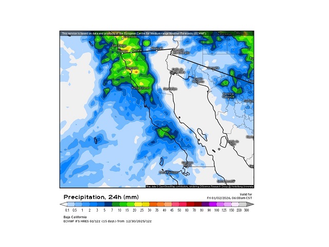 Esta condición meteorológica ocasionará probabilidad de rachas fuertes de viento, lluvias fuertes a muy fuertes e intervalos de chubascos en nuestro estado, así como la probabilidad de caída de nieve o aguanieve durante la noche en la sierra de San Pedro Mártir. Se prevé que, durante la tarde del jueves 1 de enero, la vaguada comience a debilitar, disminuyendo la intensidad de las precipitaciones.