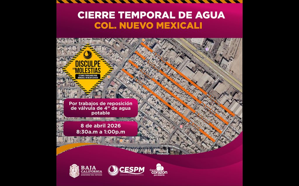 De manera adicional, CESPM informó que se realizará un cierre temporal del suministro de agua potable en la colonia Nuevo Mexicali, derivado de trabajos de reposición de una válvula de 4 pulgadas.