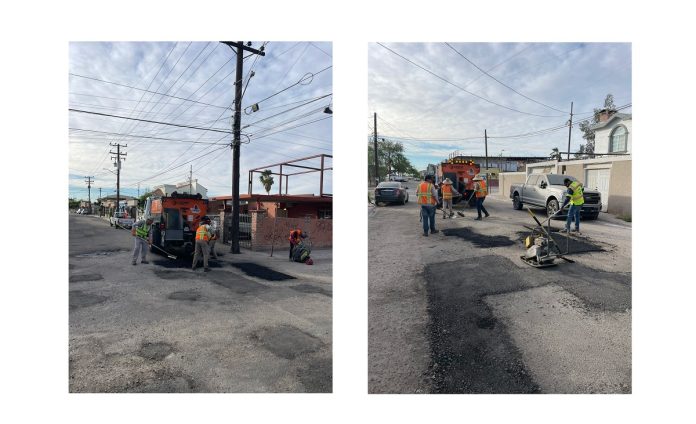 Mexicali.— 12 de abril de 2026.- La Comisión Estatal de Servicios Públicos de Mexicali (CESPM) continúa con los trabajos de rehabilitación de vialidades mediante su programa de bacheo, como parte del programa “Calles Seguras, Familias Seguras”, derivado de intervenciones en la red de agua potable y alcantarillado en diversas colonias de la ciudad.