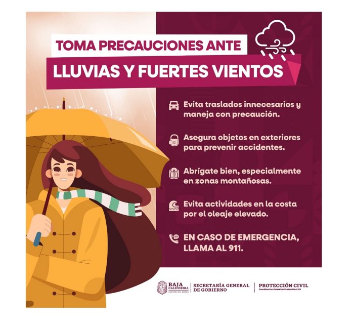 TIJUANA.- 25 de abril de 2026.- La Coordinación Estatal de Protección Civil (CEPC), con base en información del Servicio Meteorológico Nacional (SMN), informa a la ciudadanía sobre el pronóstico de lloviznas y lluvias ligeras que arribarán a Baja California a partir de la noche de este sábado 25 y hasta el martes 28 de abril.